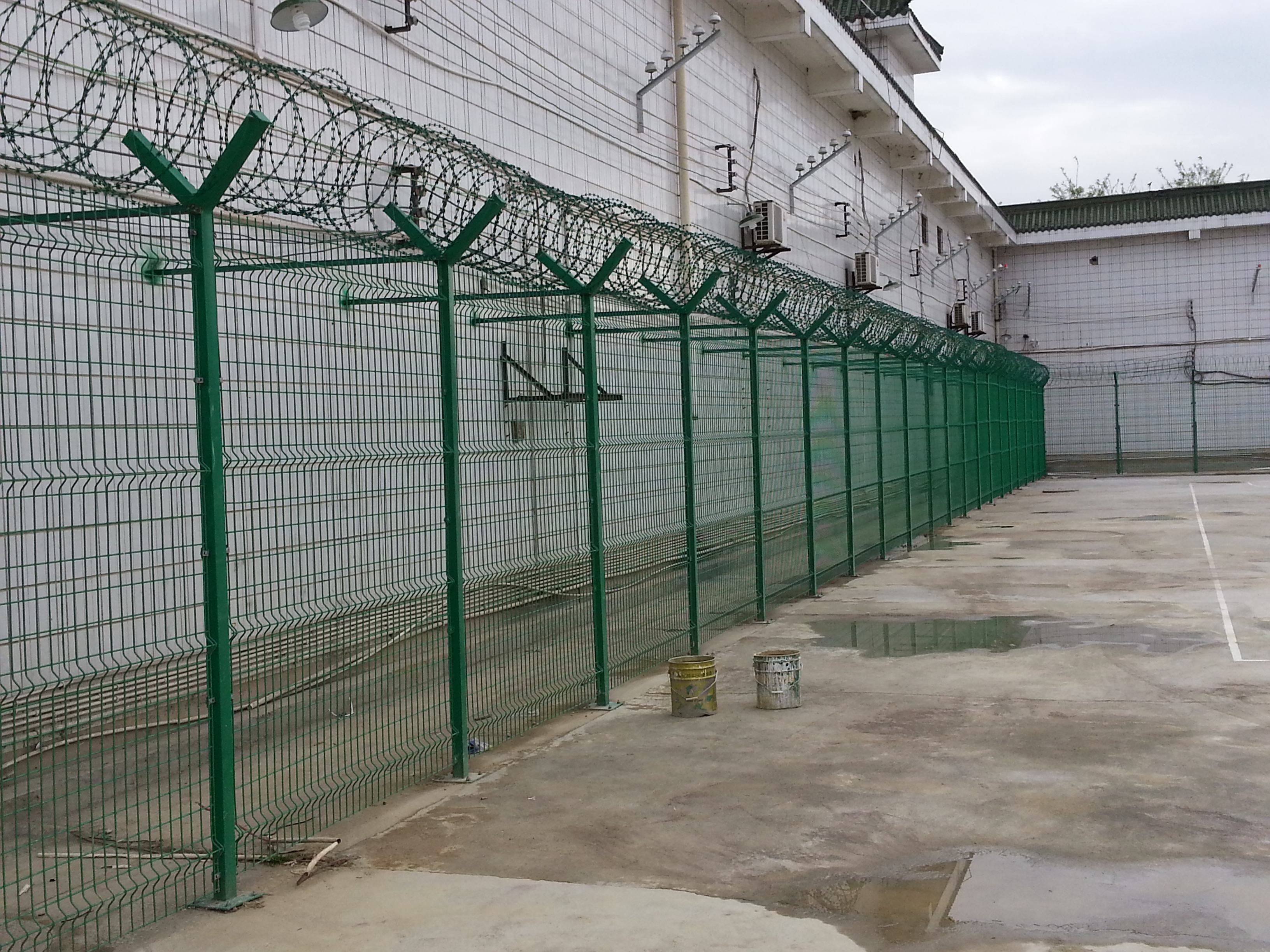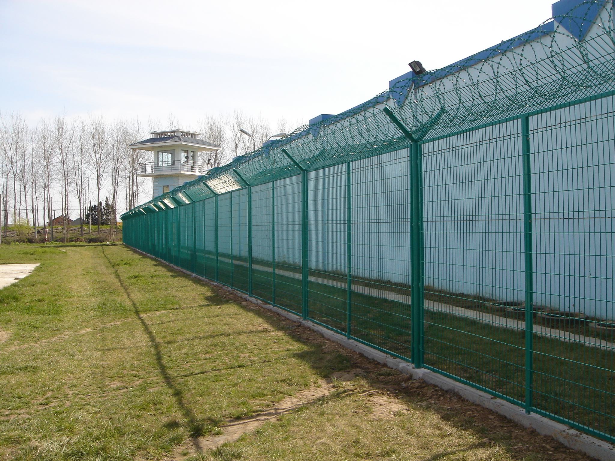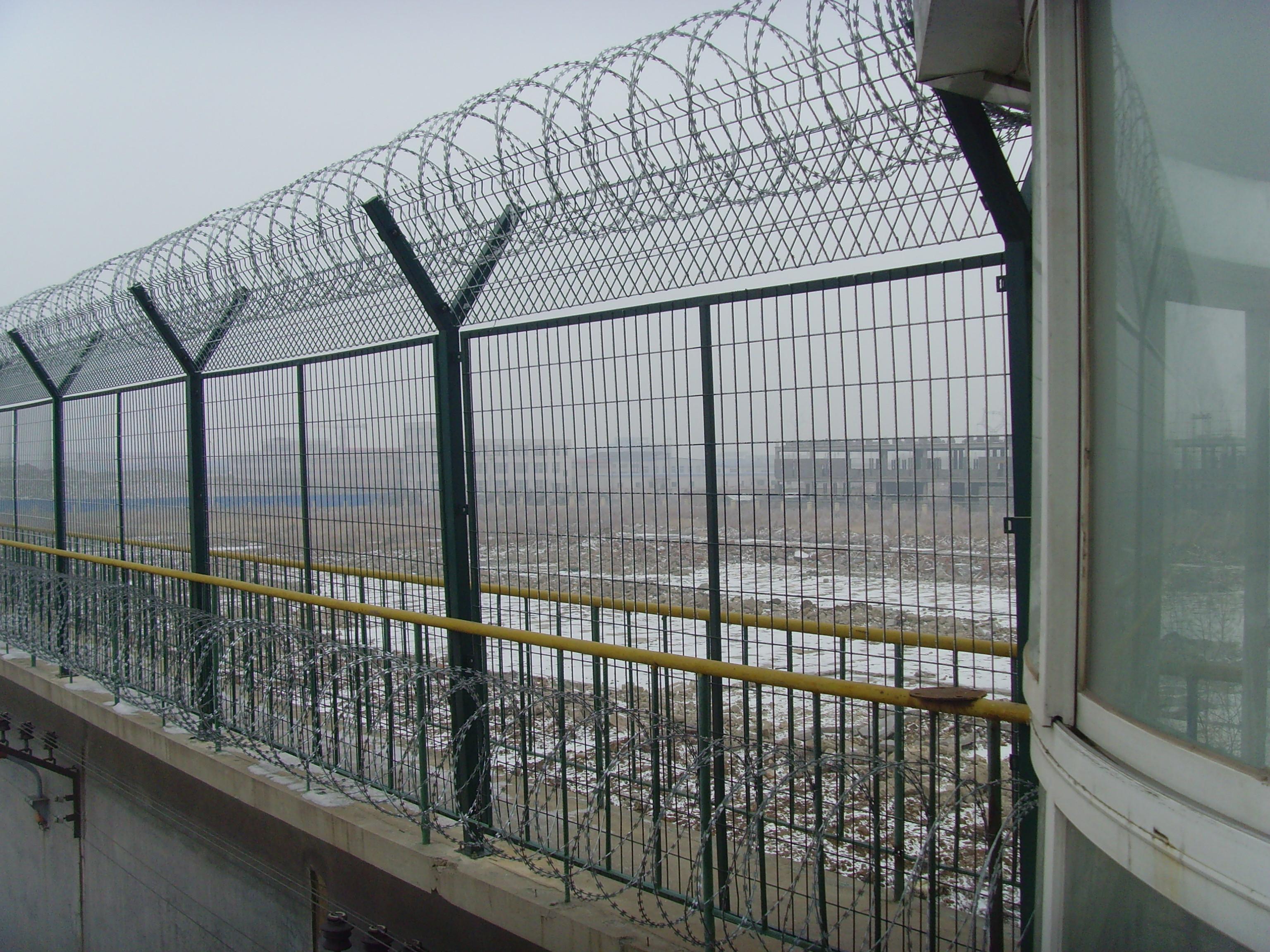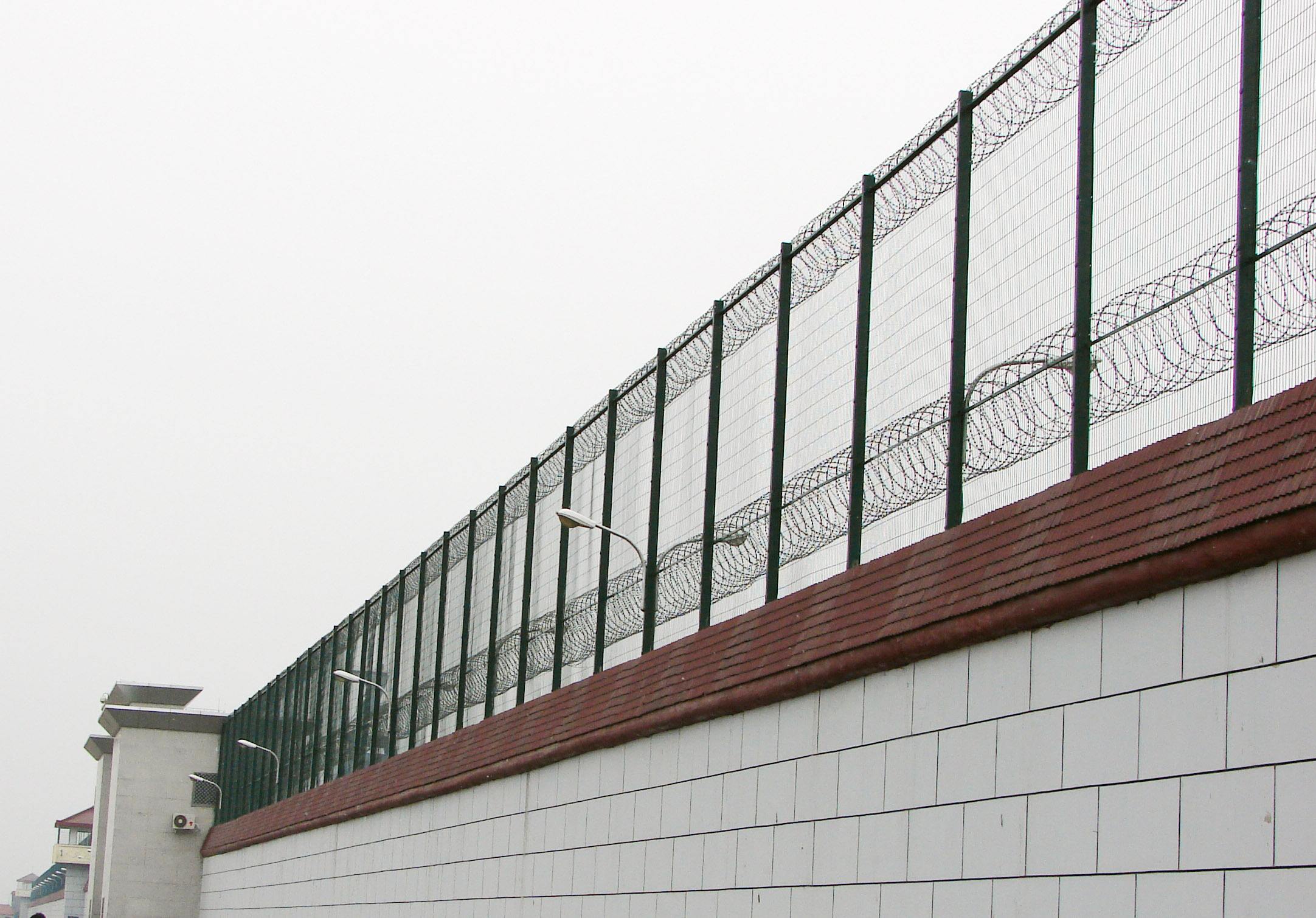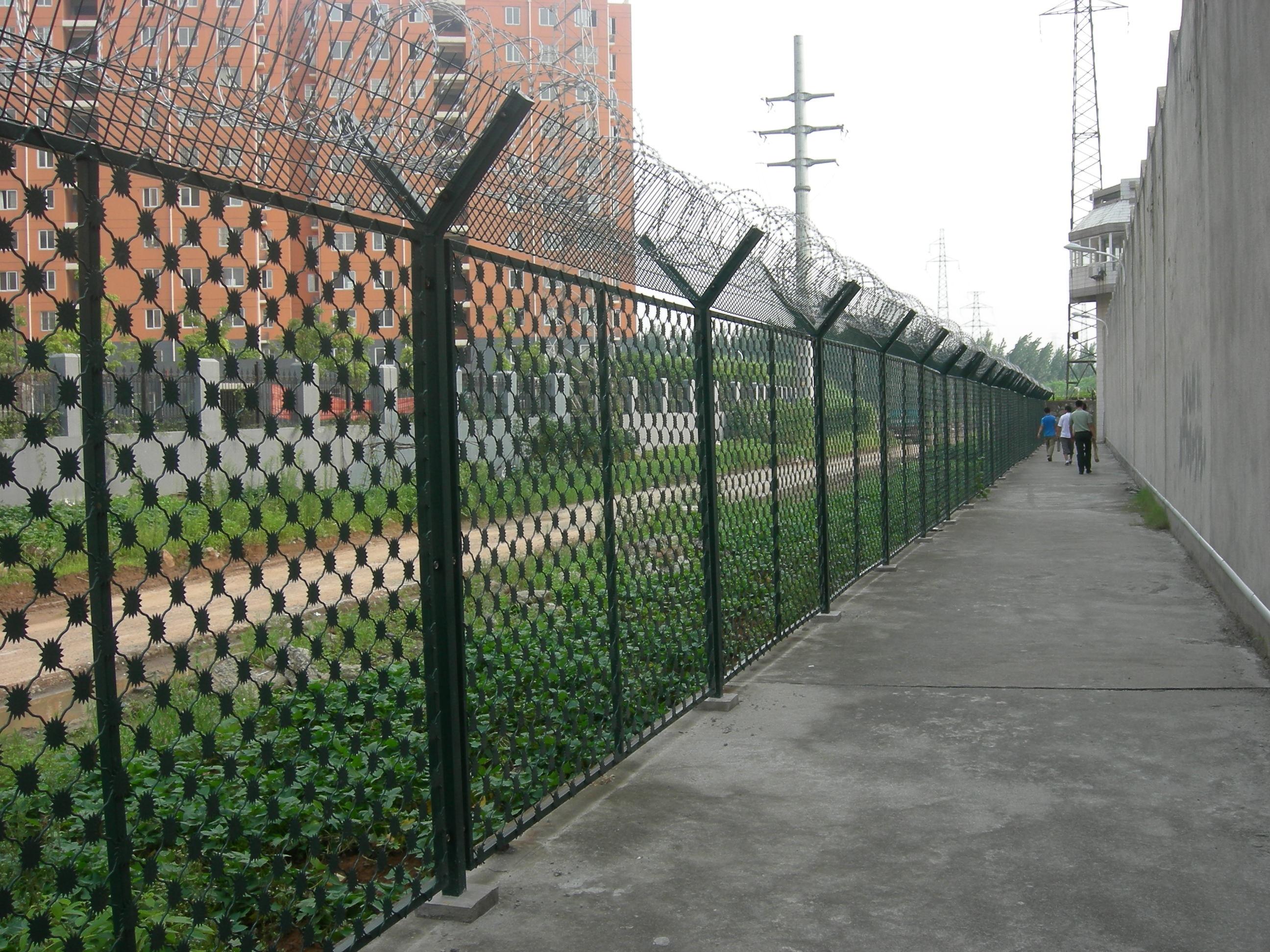 監(jiān)獄鋼絲焊接的網(wǎng)片采用低碳鋼絲焊接而成,表面采用pvc浸塑處理,與刀刺網(wǎng)連接。安裝刀刺網(wǎng)的立柱采用6CM*6CM方管,壁厚在2-2.5MM,高2.4米,底部2米圍直線,上部0.4米向內(nèi)折30度成斜線,立柱間隔為3米;橫梁采用4CM*2CM長方鋼,長3米為一個單位:立柱和橫梁表面涂黑綠色(注塑工藝),橫梁和立柱配有連接件。